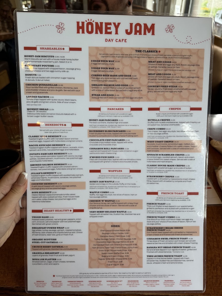 Welcome to Honey-Jam Cafe Wheaton, where warmth meets delicious culinary experiences at 351 Rice Lake Square, Wheaton, IL. This charming cafe offers a diverse menu that caters to everyone—from hearty brunch lovers to health-conscious diners. An absolute must-try is their Eggs Benedict, available in various styles like the traditional with Canadian bacon or the zesty Bacon Avocado version, bursting with flavor at just $20.19.